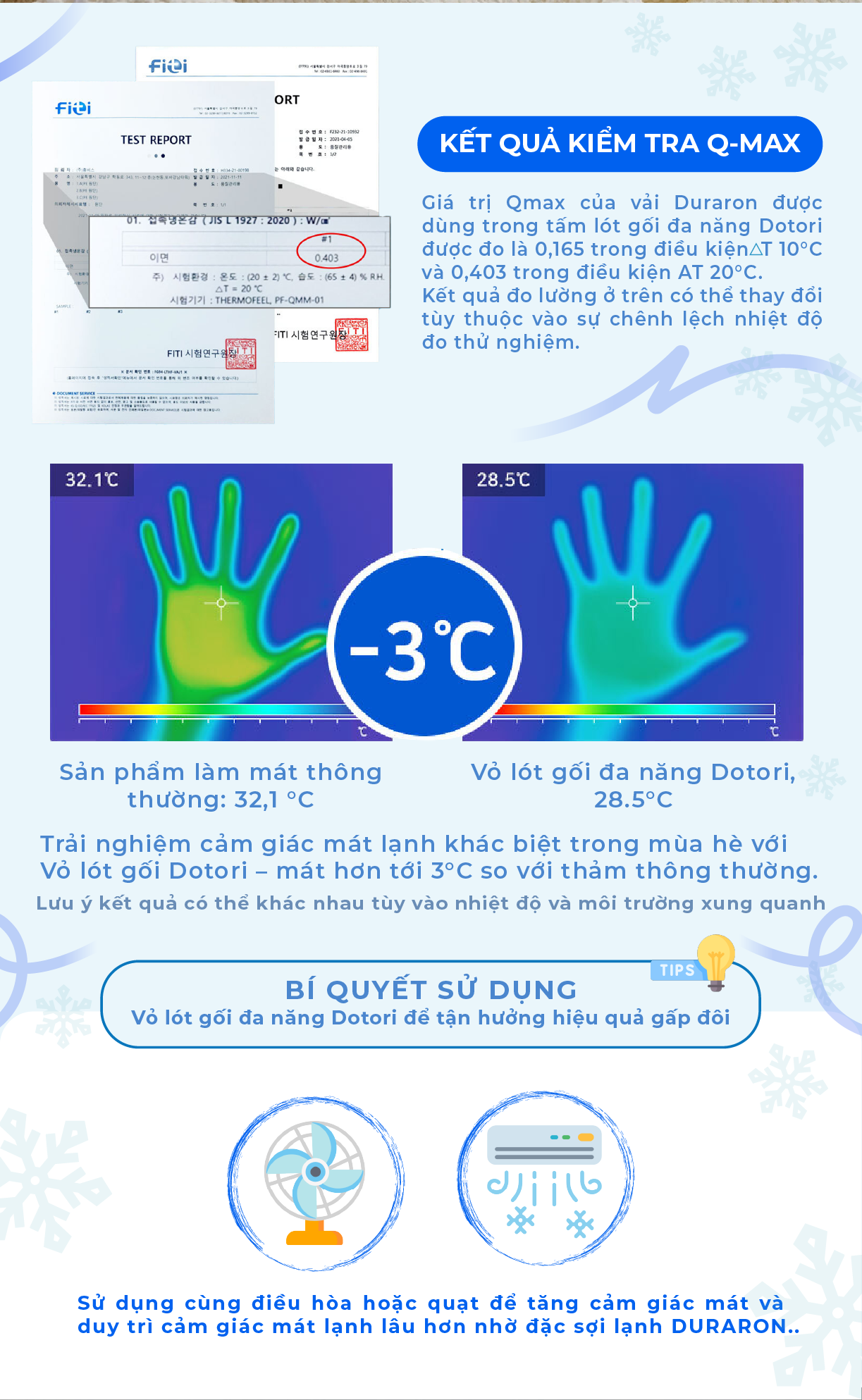 - Làm từ 100% sợi lạnh Duraron giúp điều hòa nhiệt độ hiệu quả, giảm nhiệt từ 3–6°C ngay cả khi không dùng điều hòa.