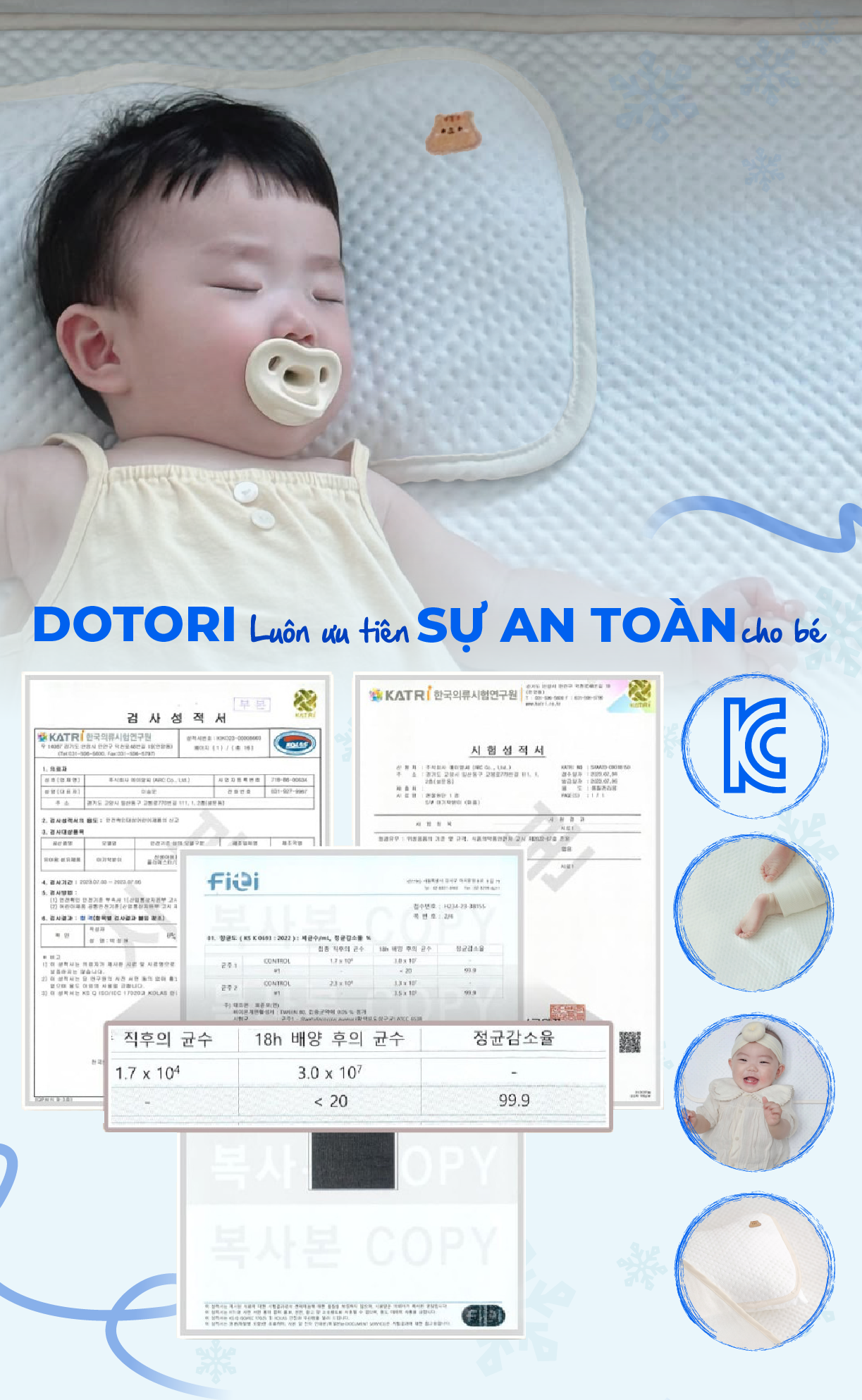 - Kháng khuẩn 99.9% do đạt chứng nhận an toàn OEKO-TEX và KC – an toàn tuyệt đối cho làn da nhạy cảm của trẻ sơ sinh.