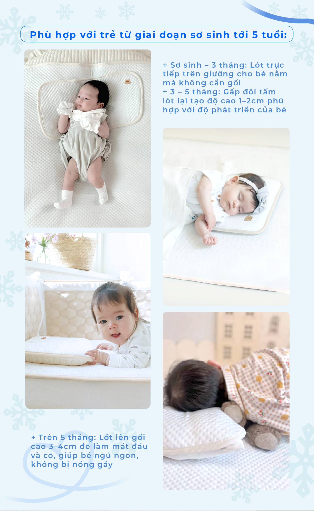 + Trên 5 tháng: Lót lên gối cao 3–4cm để làm mát đầu và cổ, giúp bé ngủ ngon, không bị nóng gáy